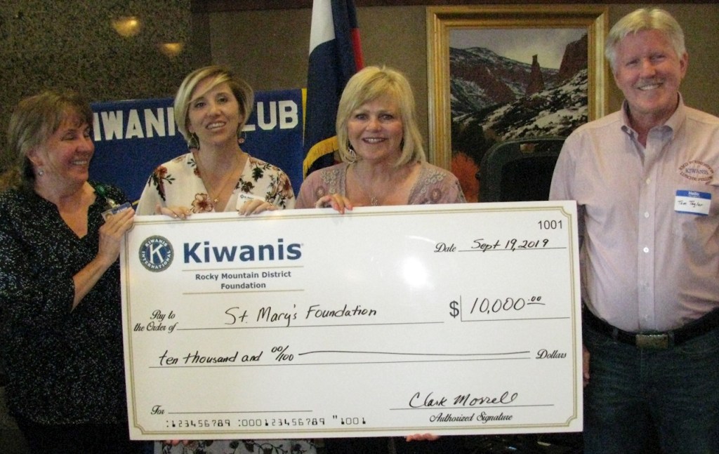 It was an exciting day at the Kiwanis Club meeting when the RMD Kiwanis Foundation presented a check to the St Mary’s Hospital Foundation for Rose Hill Hospitality House in the amount of $10,000. The mission of Kiwanis is the support of young children and their families. The funds are going to an outdoor play area for children staying at Rose Hill. Pictured left to right: Jeanie Morris – Director of Rose Hill Hospitality House, Carmen Shipley – Executive Director St Mary’s Hospital Foundation, LeAnn Zetmeir – Past Governor RMD Kiwanis and St Mary’s Hospital Foundation Chair and Tom Taylor – President RMD Kiwanis Foundation.